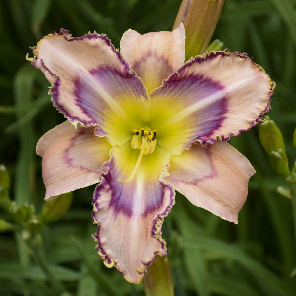 Another beautiful daylily from renowned daylily breeder Karol Emmerich! 6in triangular shaped flowers are peach with a wine purple eye. Like watercolor paint, the purple color blends to lavender purple toward the yellow throat for a stunning display. A thin, purple picotee edge frames the edge of the blooms.